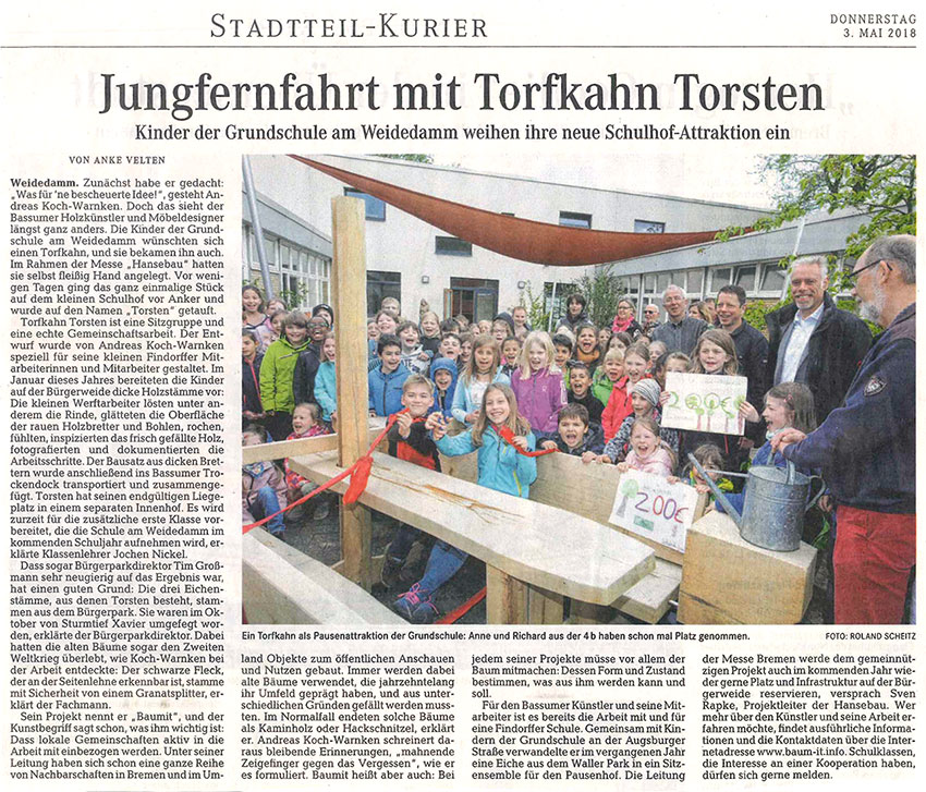 Unter dem Motto 'Jungfernfahrt mit Torfkahn Torsten' wurde die neue Sitzgruppe auf dem Schulhof der Grundschule am Weidedamm eingeweiht. Die Sitzgruppe entstand als Gemeinschaftsarbeit im Rahmen der Messe „Hansebau“.